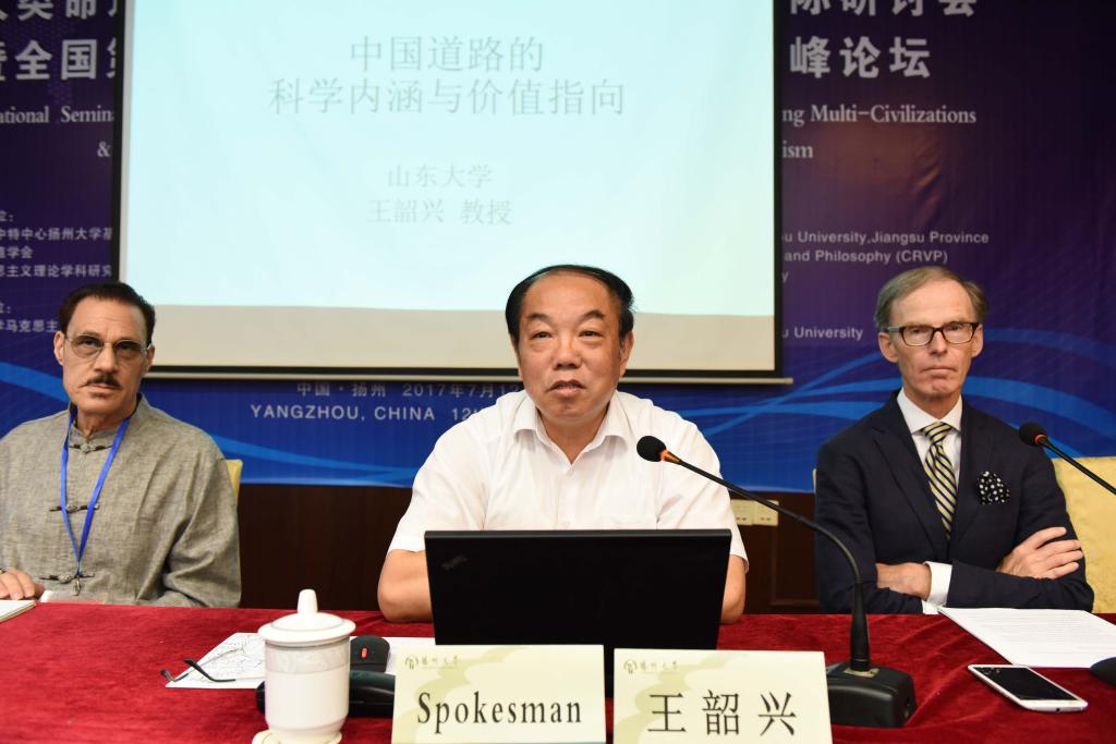 7月12-13日,由江苏省中特中心扬州大学基地、国际价值学会和《马克思主义理论学科研究》主办的“人类命运共同体与多元文明的对话” 国际学术研讨会暨全国第三届中青年马克思主义学者高峰论坛在扬州大学召开。研讨会由扬州大学马克思主义院长佘远福主持,党委书记姚冠新教授、国际价值学会副主席沈青松教授分别代表主办方致辞。我院院长、博士生导师王韶兴教授以及博士研究生王国龙应邀参加会议。